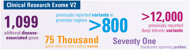 SureSelect 临床研究全外显子组 V2对1099种疾病相关基因进行了额外的加密,并包含了75000种非编码外显子的拼接位点,涵盖了超过12000个之前报告的内含子区域变异和800个启动子区域变异。71个跨断裂点探针用于常见基因缺失/融合研究。